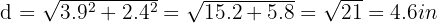 of this rectangle divides it into two right triangles with legs of 2.4 in and 3.9 in, and the diagonal coincides with the hypotenuse of these triangles. So again we must use the formula to calculate the hypotenuse: