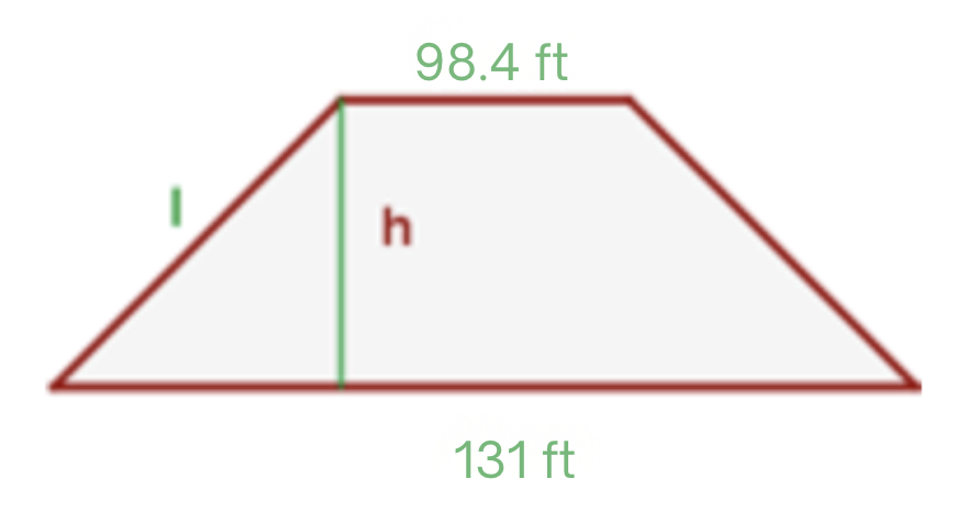 The perimeter of an isosceles trapezoid is 361 ft, the bases measure 131 ft and 98.4 ft respectively. Calculate the non-parallel sides and the area.