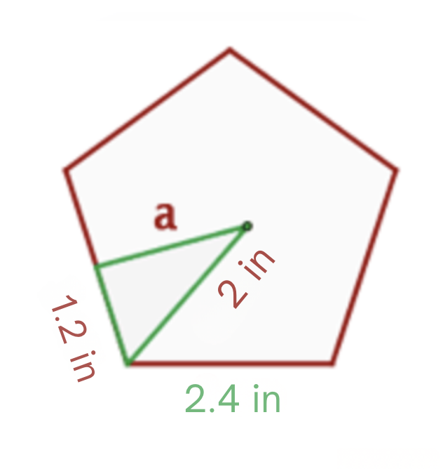We have that the sides of the regular pentagon measure 2.4 in. Since the area of the pentagon is equal to half the perimeter times the value of the apothem, then we must find the value of the apothem. We will call the apothem