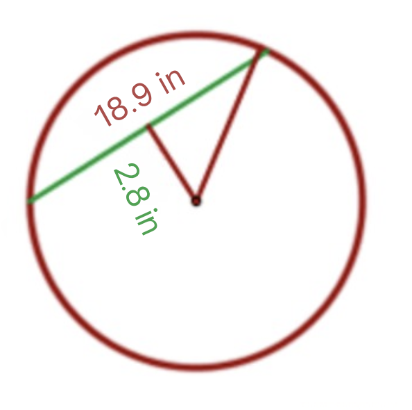 To calculate the area of the circle we must first find its radius. Since the chord of the circle is 2.8 in from the center, we can form a right triangle with legs 2.8 in, half the chord (9.4 in), and hypotenuse equal to the radius of the circle,