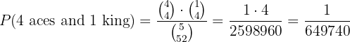 For 4 aces there is only one possibility, and to have a king there are four possibilities. In other words, we multiply the possibilities for 4 aces by those for the king: