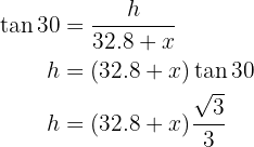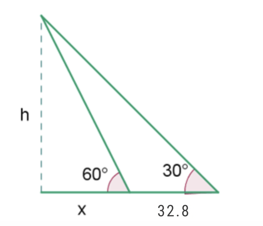 Calculate the height of a tree, knowing that from a point on the ground its top is observed at an angle of 30° and if we approach 32.8 feet, at an angle of 60°.