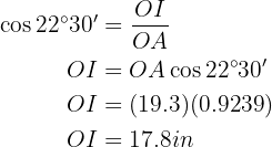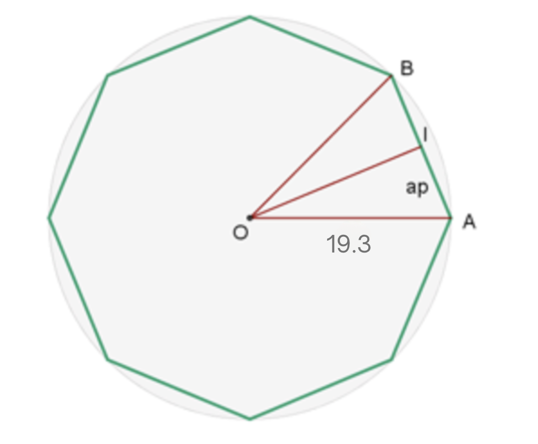 Calculate the length of the side and apothem of a regular octagon inscribed in a circle with a radius of 19.3 inches.