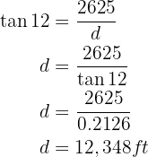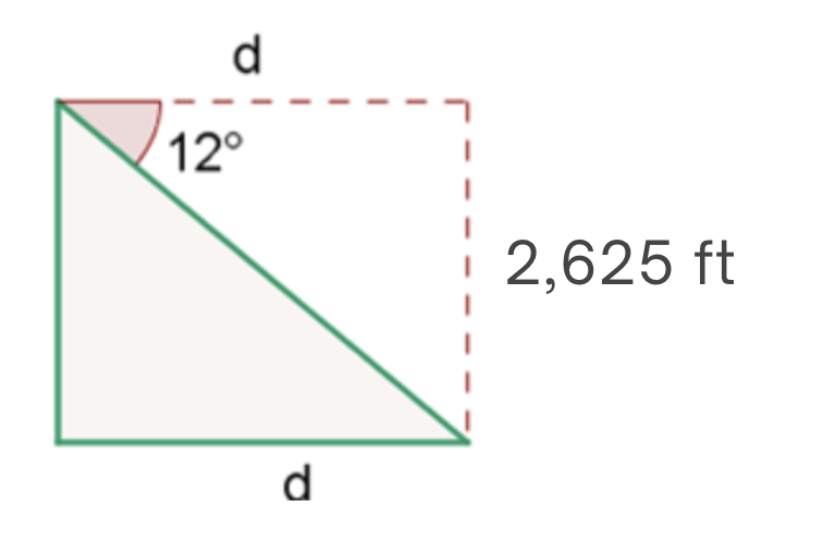 A blimp flying at 2,625 feet altitude spots a town with a depression angle of 12°. How far from the town is it?