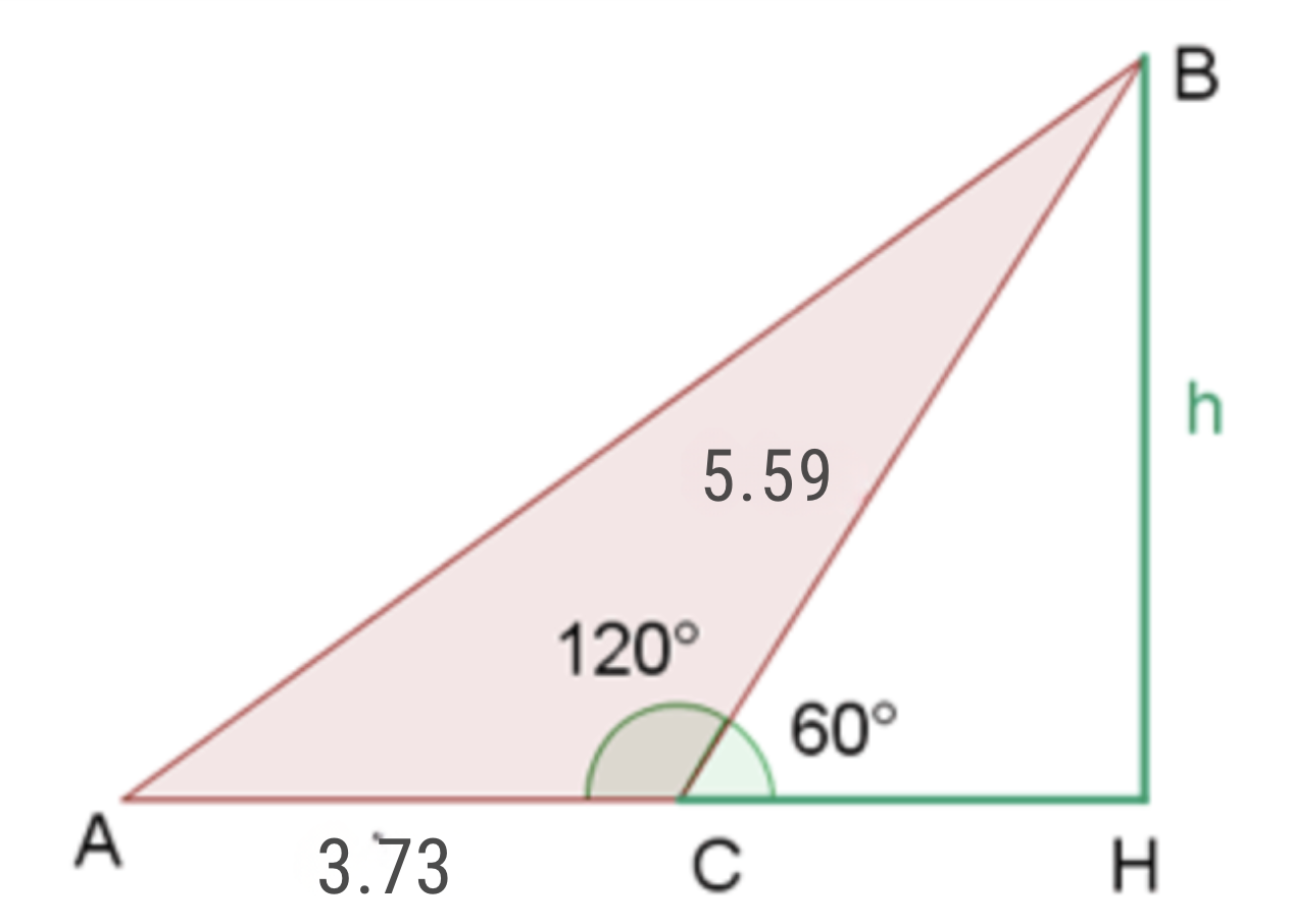 Note that the height divides our initial triangle into two right triangles. We will use the triangle on the right, since we have more information about it, to obtain the height value and then calculate the area. To obtain the height, we will use the sine of angle