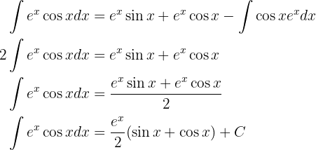 Substituting all this into our first integral we have that the integral we want to calculate appears on the left side and on the right side but with a negative sign, therefore all we need to do is solve for the integral we want to find: