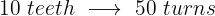These are inversely proportional quantities, since fewer teeth will make more turns