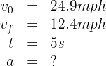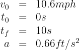 3. We verify that we have the same units. We note that the initial and final velocities are given in miles per hour and the acceleration in feet per second squared, so we convert the velocities to feet per second: