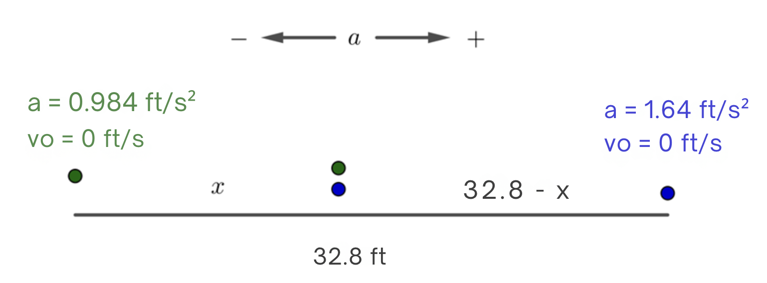 Two particles are separated by 32.8 feet. If both start from rest with accelerations of